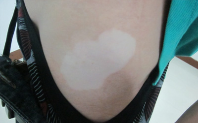 病情陈述:过敏之后过度使用激素药膏止痒,颈部出现白斑,从鸡蛋大小扩散成巴掌大小,边界模糊