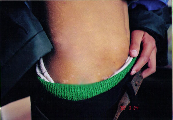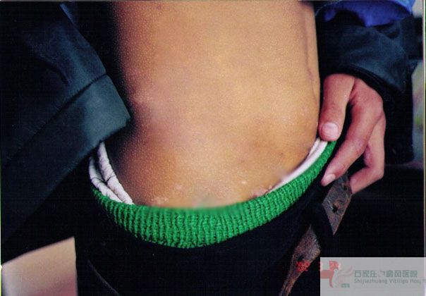 患者李XX,男,50岁。发病1年,右侧腹部皮肤呈现出不规则形白斑,有的已融合成片,经过多方求治,已有部分好转,但治疗效果仍不满意。为求进一步治疗,到我院就诊。