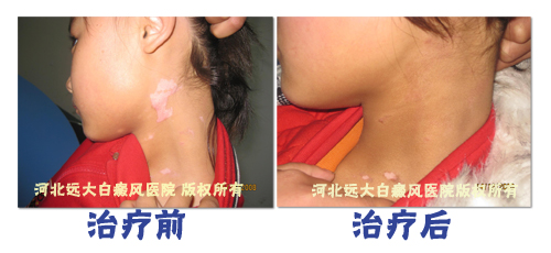 经我院专家治疗运用中医细胞面医疗配合美国308nm准分子激光治疗仪进行治疗。3个疗程后白斑基本消失。回访半年无复发。