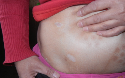 李女士的白斑是在孕期出现的,主要分布在肚子上,有大有小,白斑为近圆形,有部分为点状,颜色比较淡,按压后会变红,没有痛感和痒感,白斑没有凹陷和突出的表现。