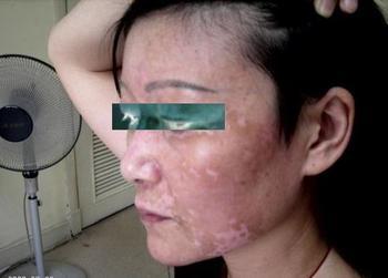 病情陈述:过敏之后过度使用激素药膏止痒,颈部出现白斑,从鸡蛋大小扩散成巴掌大小,边界模糊