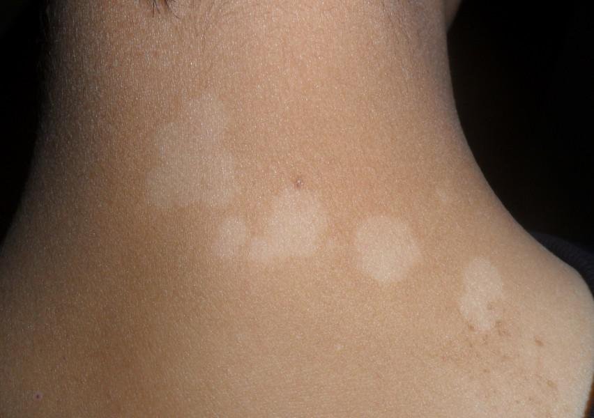 病情陈述:过敏之后过度使用激素药膏止痒,颈部出现白斑,从鸡蛋大小扩散成巴掌大小,边界模糊