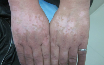 恢复情况:治疗一段时间,黑色素细胞恢复状况良好,白斑逐渐好转,直至复色,后巩固治疗,身体各项指标接近正常水平,无新增白斑。