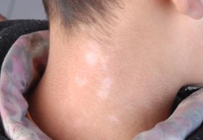 病情陈述:过敏之后过度使用激素药膏止痒,颈部出现白斑,从鸡蛋大小扩散成巴掌大小,边界模糊